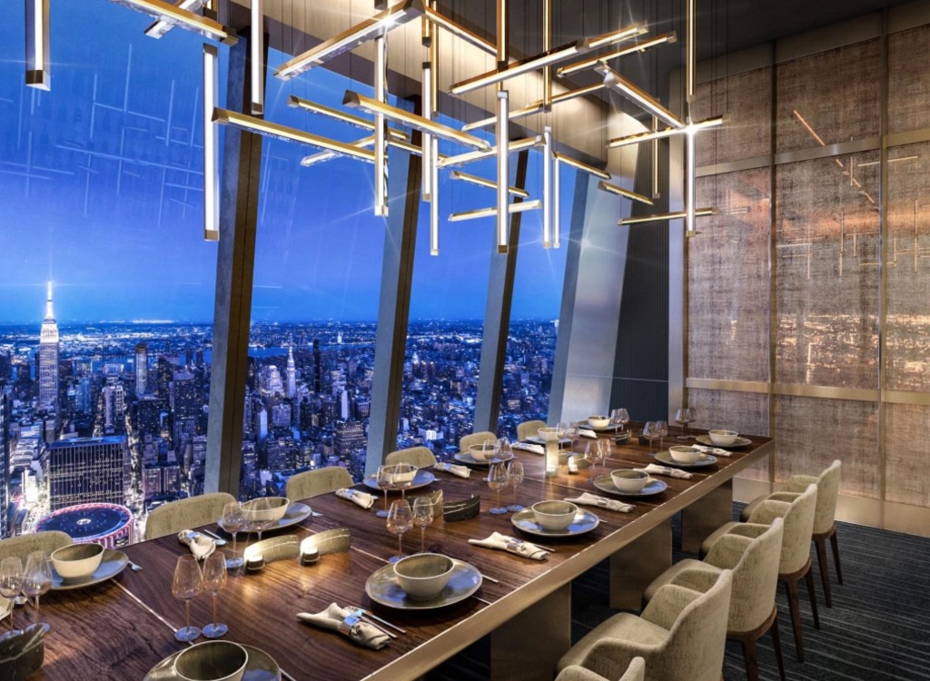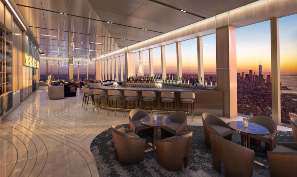 These exclusive renderings show David Rockwell’s sleek designs. Peak boasts a U-shaped marble bar, dark oak floors, marble and wood tabletops, and plushly upholstered banquettes and chairs. A mirror-polished metal ceiling will reflect the skyline.