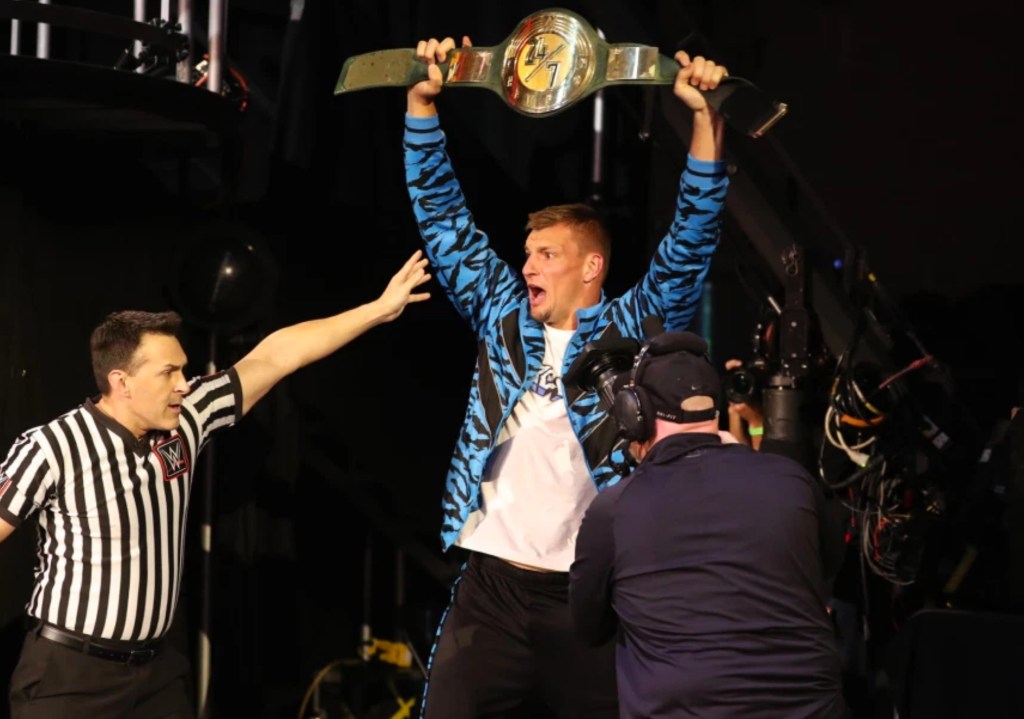 Rawley’s title reign was short lived after Gronkowski declared early in the broadcast Sunday he was going after the championship. Gronkowski ended up jumping off a small balcony into a large group of wrestlers who were chasing after Rawley. After the wipe out, it was Gronkowski who pinned the champ and ran off with the belt.