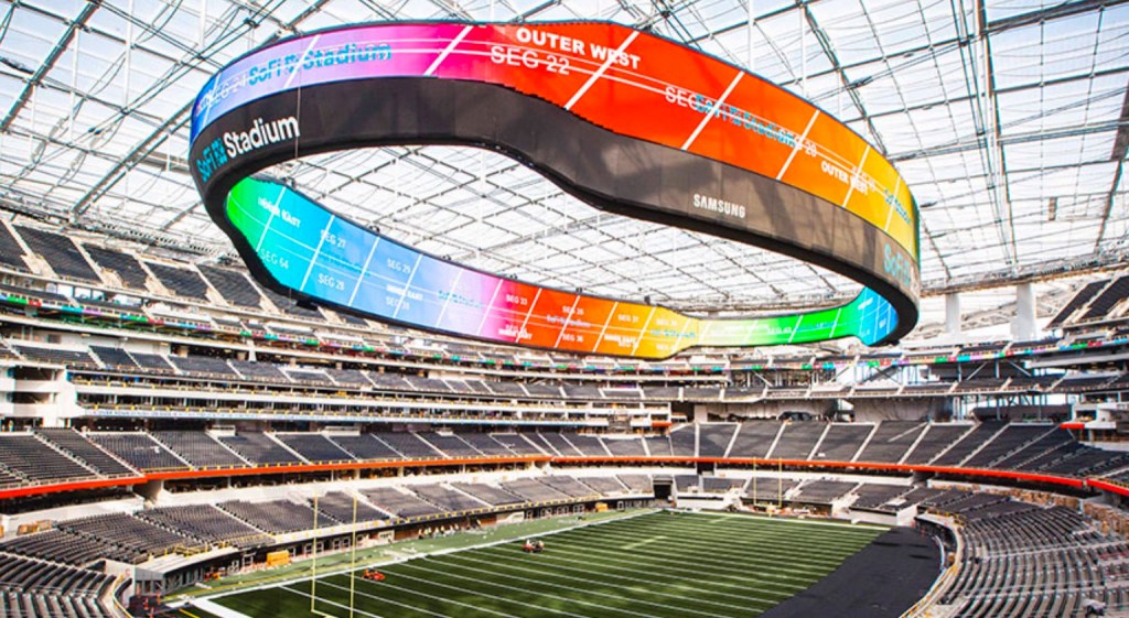 Besides the video board, SoFi Stadium, named for a personal finance company Social Finance, boasts numerous amenities the public will have to wait to see. It has a regular capacity of 70,000 permanent seats, expandable to 100,000, with 260 luxury suites and 13,000 “premium” seats.