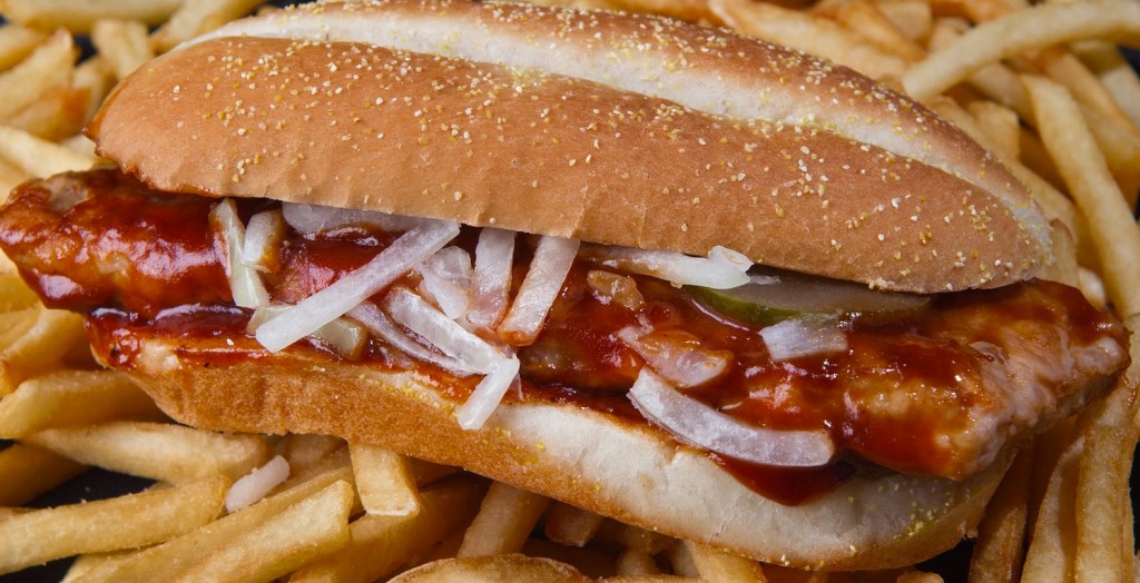 The McRib first launched four decades ago, and very quickly became a huge hit with McDonald’s eaters, for its “seasoned boneless pork patty slathered in BBQ sauce and topped with slivered onions and tart dill pickles, all on a homestyle bun.”