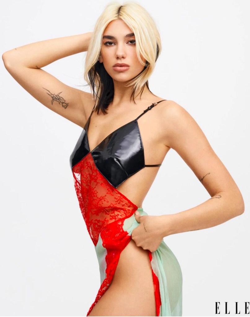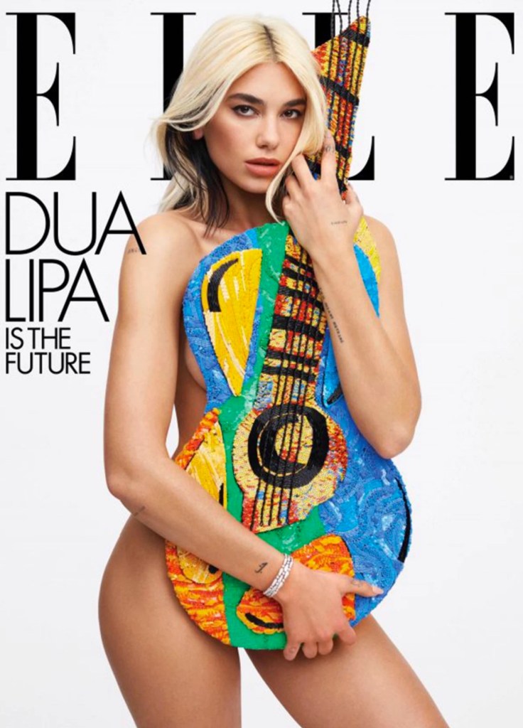 The “Don’t Start Now” singer, 24, posed for the cover of Elle magazine completely nude, save for a colorful embellished Moschino guitar.