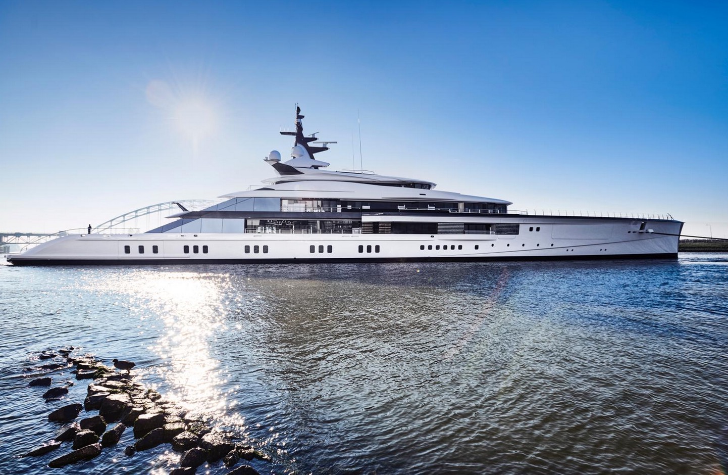 The Oceanco Bravo Y718 (which Jones named “Bravo Eugenia” after his wife) has everything you could imagine, and then some. We’re talking two helipads for quick jaunts to ports of call, a full spa with a massage room and sauna, pool, gym, “beach club”, Jet Skis, and even a garage to store smaller boats.