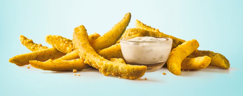 New Pickle Fries are a twist on traditional fried pickles, featuring dill pickle spears cut in a fry shape, coated in a light tempura coating and fried up until crispy. They come served with a side of ranch sauce for dipping.