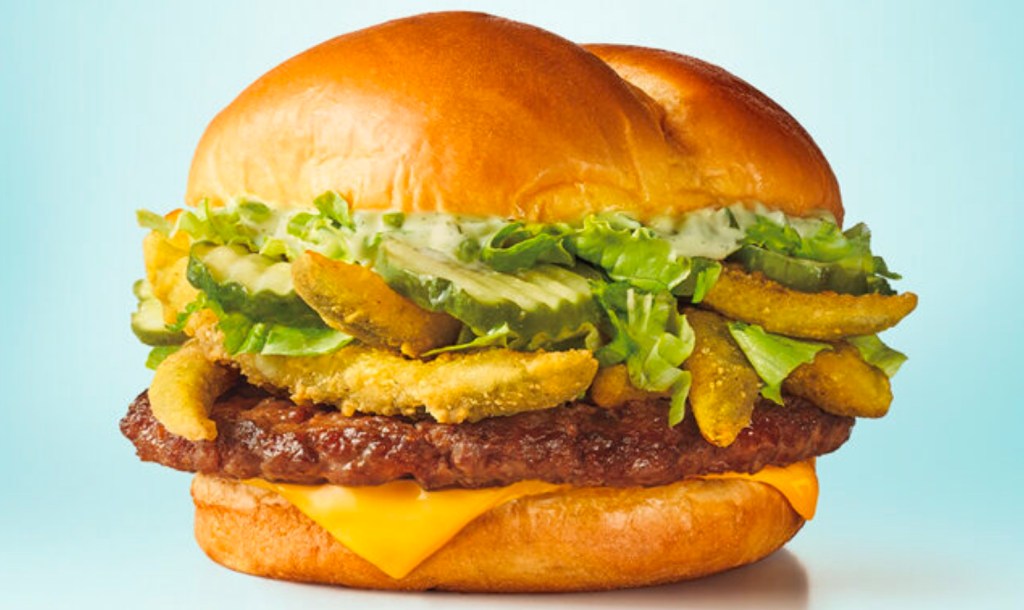 The new Big Dill Cheeseburger features a 100 percent pure seasoned beef patty stacked with crispy pickle fries, crinkle-cut pickle slices, a creamy dill-infused ranch sauce, chopped lettuce, and melty American cheese, all layered on a toasted brioche bun.