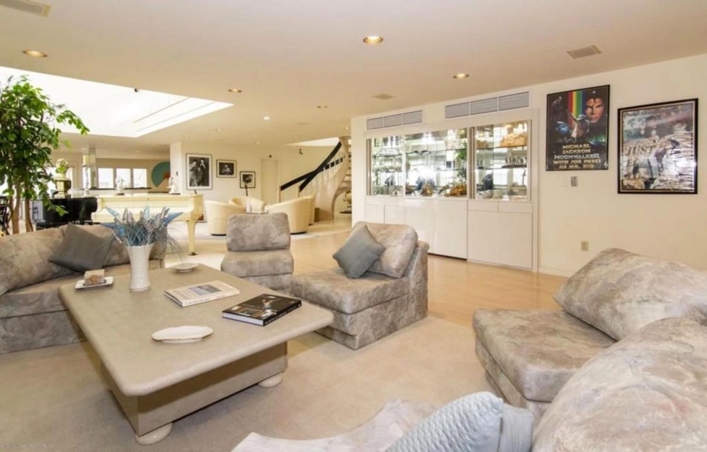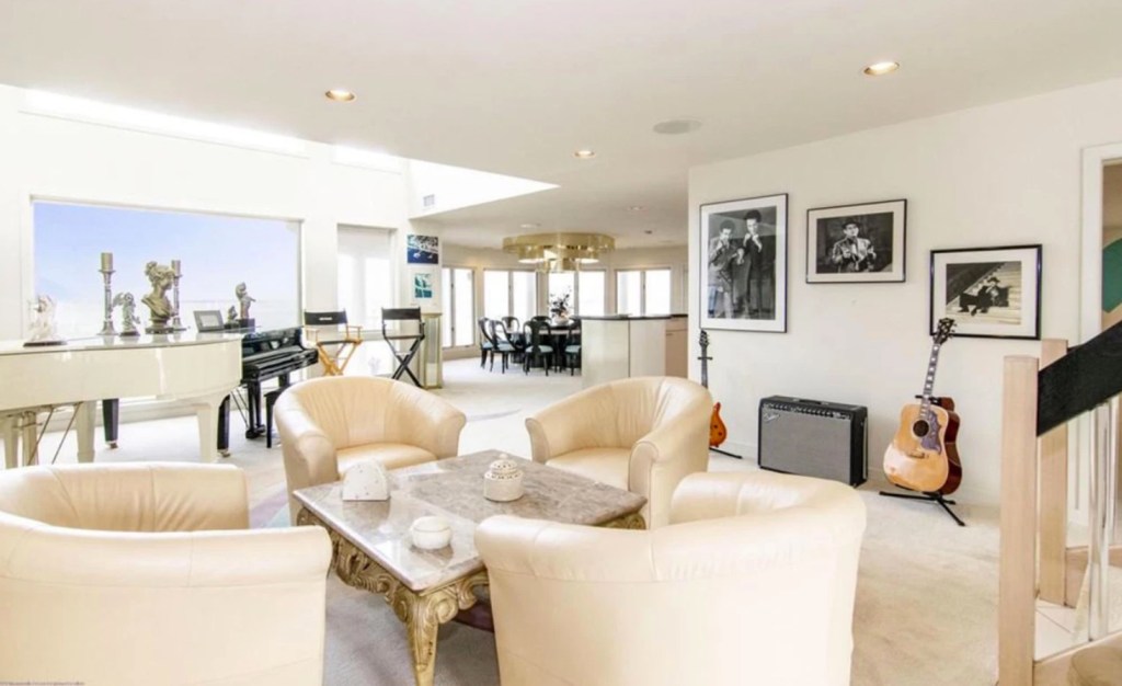 The two-part open living room is filled with old movie posters, a memorabilia display case, two guitars, an amplifier, a piano and two director’s chairs.