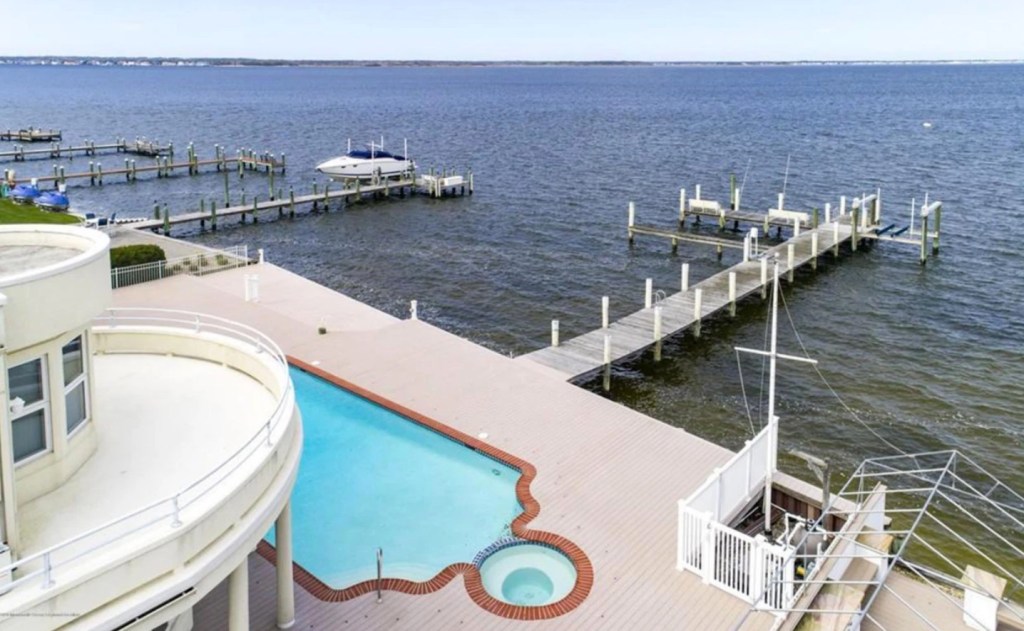 An outdoor patio surrounds a heated pool and spa, from which a not-too-long dock extends directly into the bay.