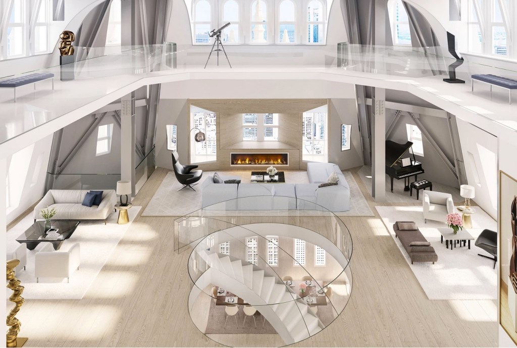 Details include 125 windows, 24-foot ceilings, a private elevator — and a 408-square-foot observatory terrace. The buyer will also have access to the building’s amenities, which include a gym, a lounge, a pool, a wine cellar and tasting room.
