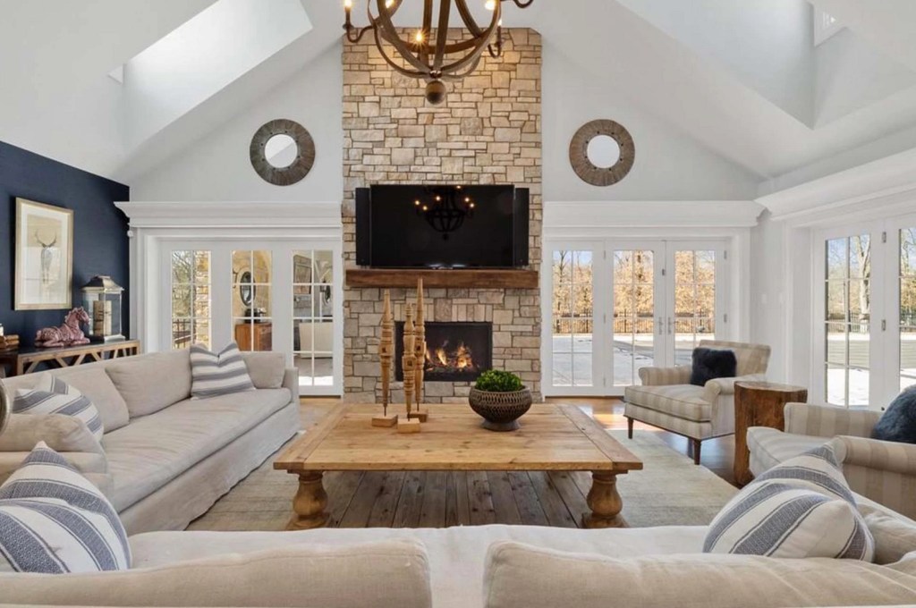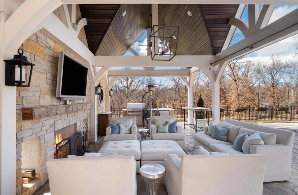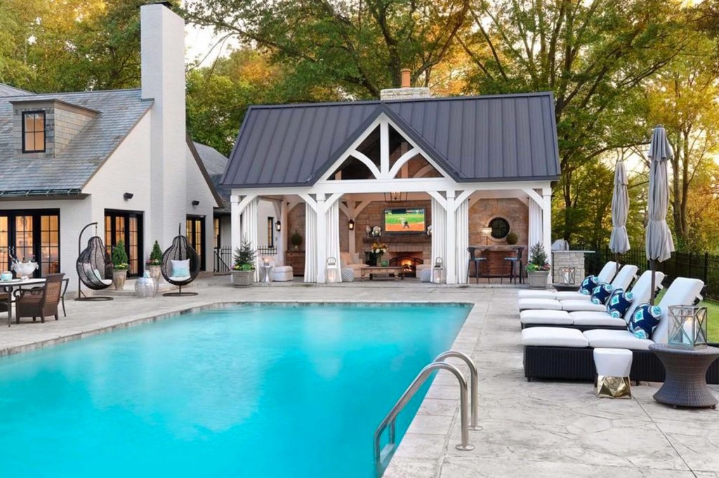The family room’s french doors open to a sloped, fenced lawn on 6 acres. The estate has a child’s playground, pool, built-in grill and a decked-out cabana with stone walls, a fireplace, television, wrought-iron chandelier, wooden beams and a steeply-pitched roof.
