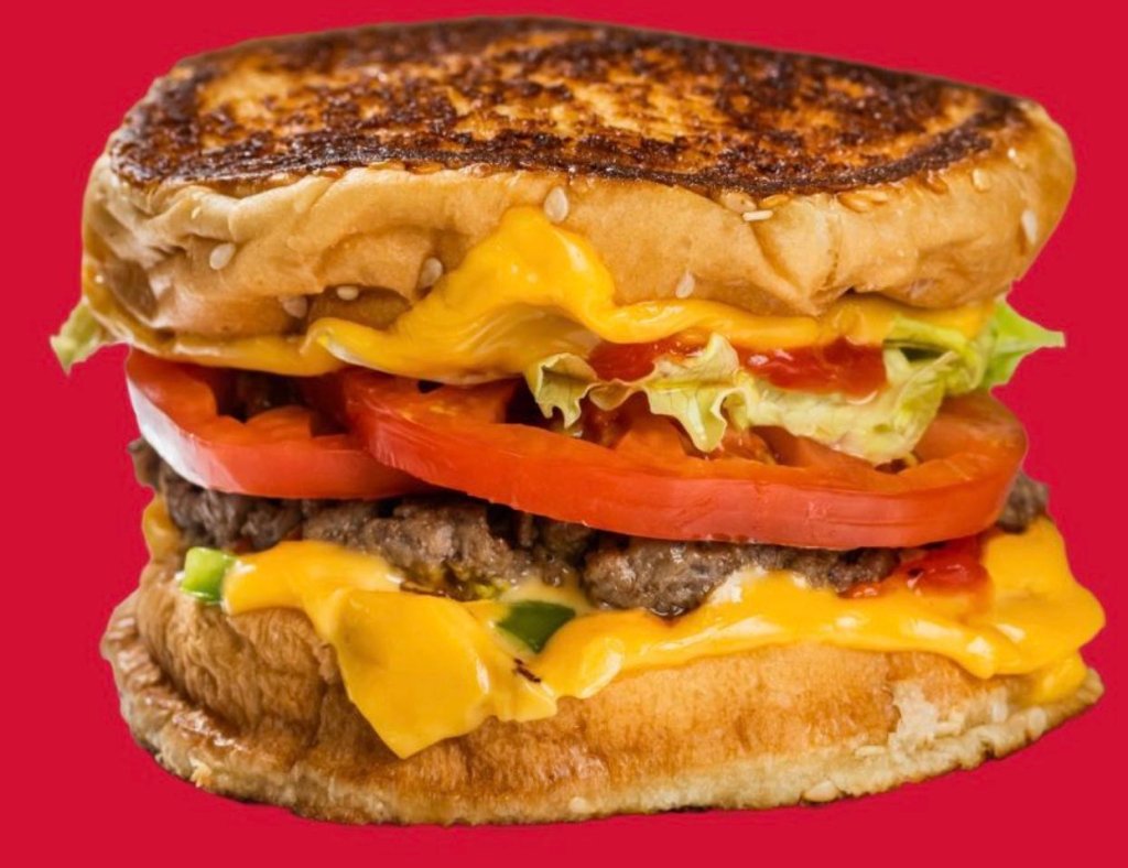 According to the Five Guys website, the Patty Melt features “a burger patty in between slices of American-style cheese melted on a toasted, inside-out sesame seed bun with toppings of your choice.”