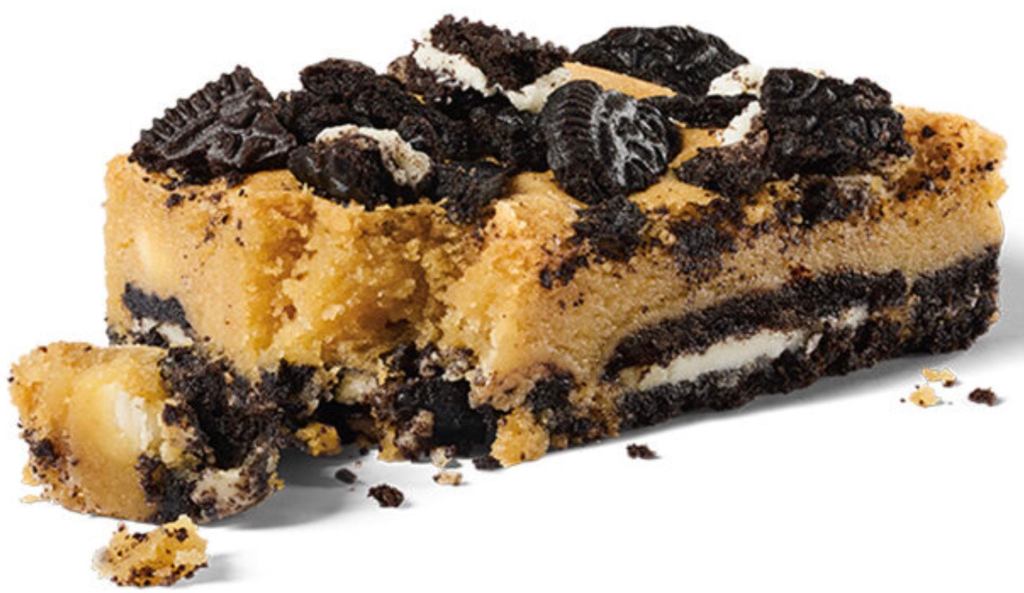 The Oreo Ultimate Cookie Bar features a soft and chewy vanilla blondie loaded with Oreo chunks and white chocolate chips, topped with Oreo pieces and Oreo crust underneath.